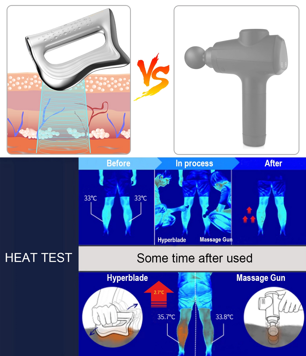 Compared to the traditional fascia gun that acts only on epidermal tissue, the Hyperblade™ uses NMES and microvibration technology to massage and directly target deep muscle tissue, moreover its thermal effect enhance oxygen supply, accelerate blood circulation and muscle recovery.