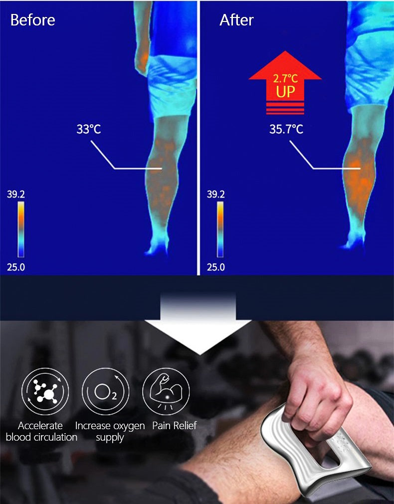 Compared to the traditional fascia gun that acts only on epidermal tissue, the Hyperblade™ uses NMES and microvibration technology to massage and directly target deep muscle tissue, moreover its thermal effect enhance oxygen supply, accelerate blood circulation and muscle recovery.